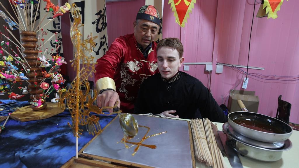 1月22日,亚历山德罗在上海豫园商城一家糖人店向师傅请教糖人制作技巧。新华社记者 王翔 摄