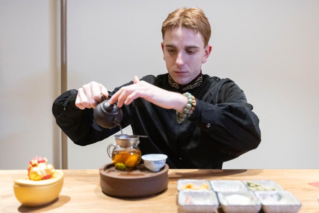 1月22日,亚历山德罗在上海豫园商城体验茶艺。新华社记者 王翔 摄