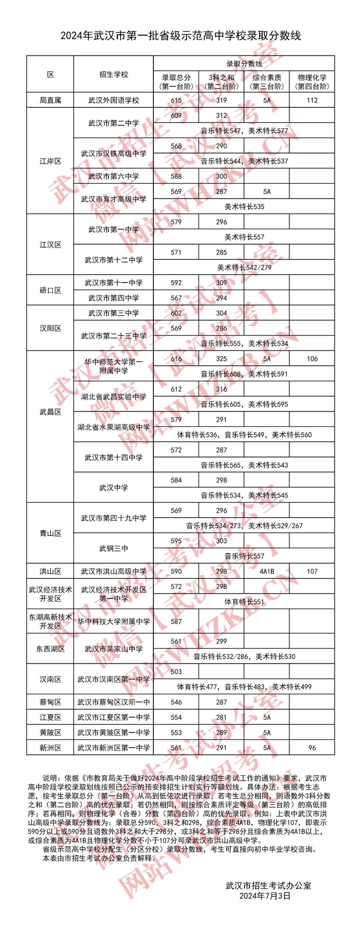 7月3日,武汉市27所第一批录取的省级示范高中公布录取分数线。