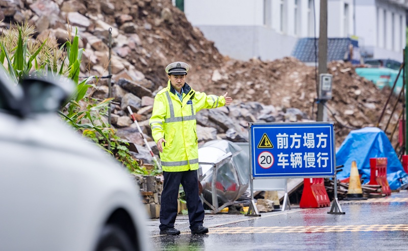 图为近日,湖北省长阳土家族自治县公安局高家堰派出所民警冒雨在辖区道路塌方维修路段执勤,提醒过往车辆减速慢行,确保通行安全。本报记者 刘欢 本报通讯员 胡灿 摄