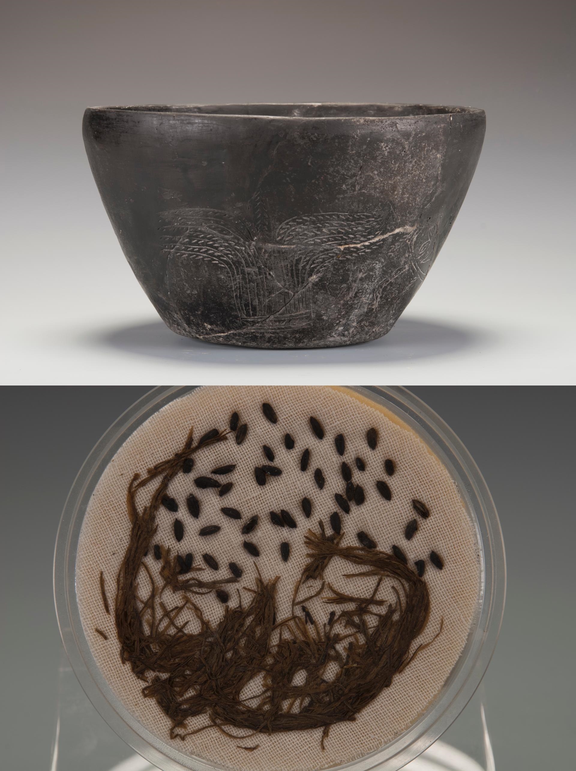 △上图:新石器时代河姆渡文化稻穗纹盆 浙江省博物馆藏;下图:新石器时代河姆渡文化稻秆、稻叶、稻谷 浙江省博物馆藏