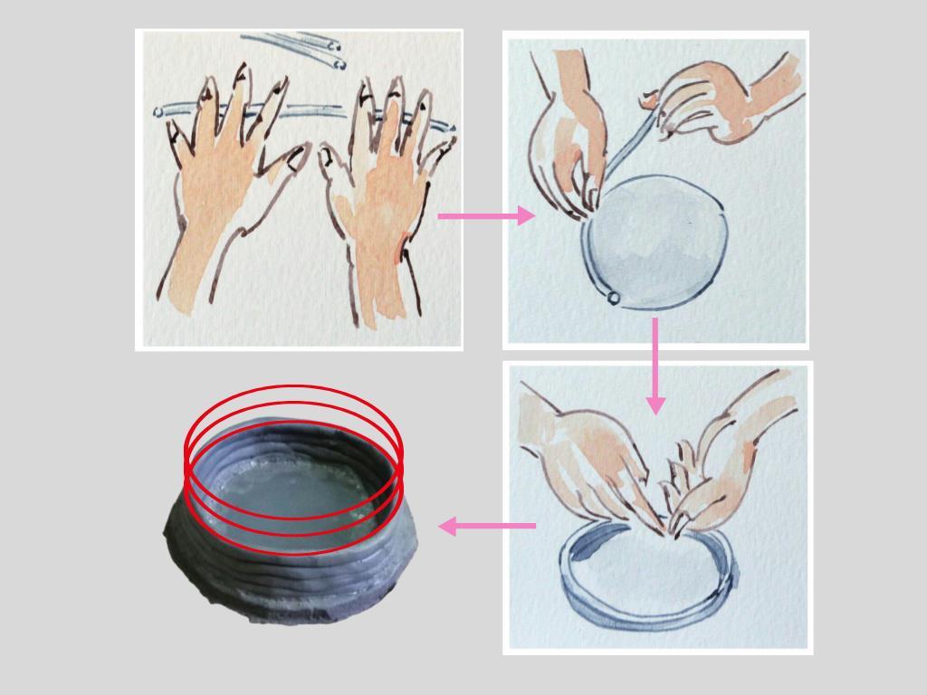 再用手沾水抹平一棱一棱的泥条痕迹