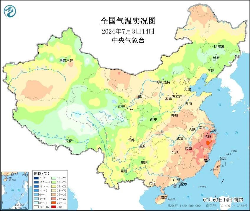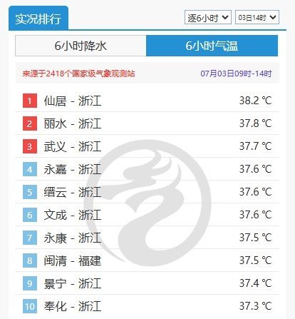 浙江、福建等地因为受到副热带高压的控制,出现闷热型高温。截至14时,浙江几乎包揽全国高温榜前十位,由于午后湿度高、风力小,部分站点体感温度甚至超过42℃。