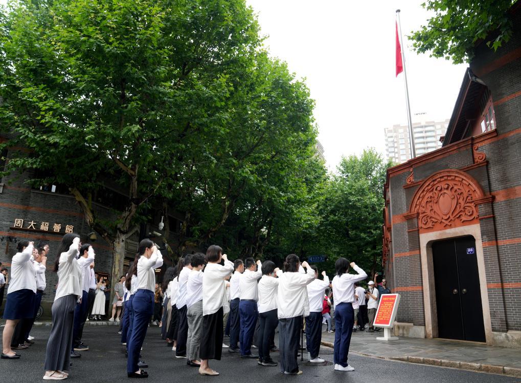7月1日,上海中共一大纪念馆的党员在一大会址前重温入党誓词。新华社记者 刘颖 摄