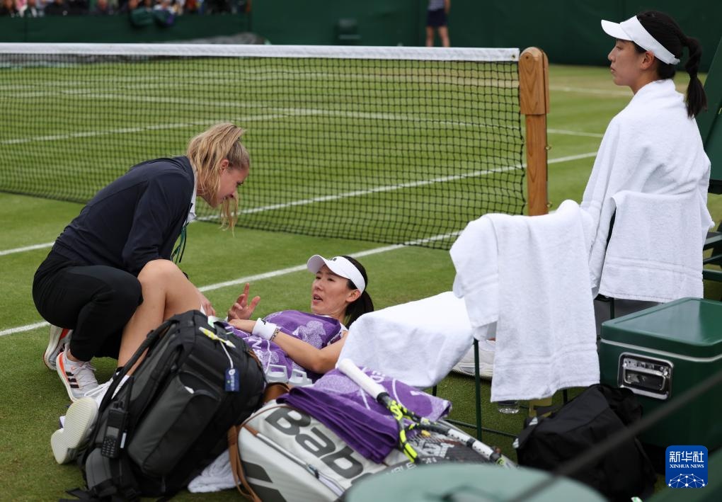 7月3日,郑赛赛(下)在第一盘结束后接受治疗。新华社记者 韩岩 摄