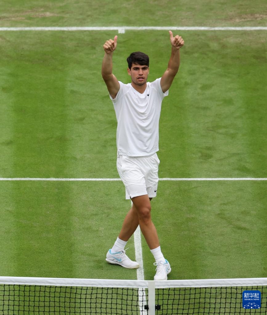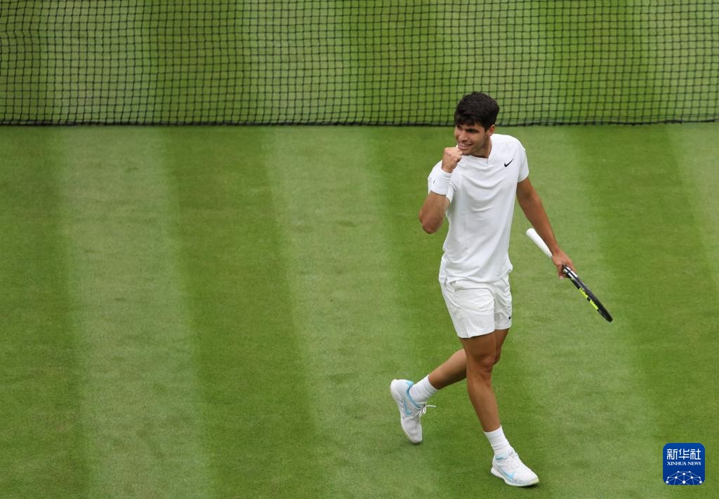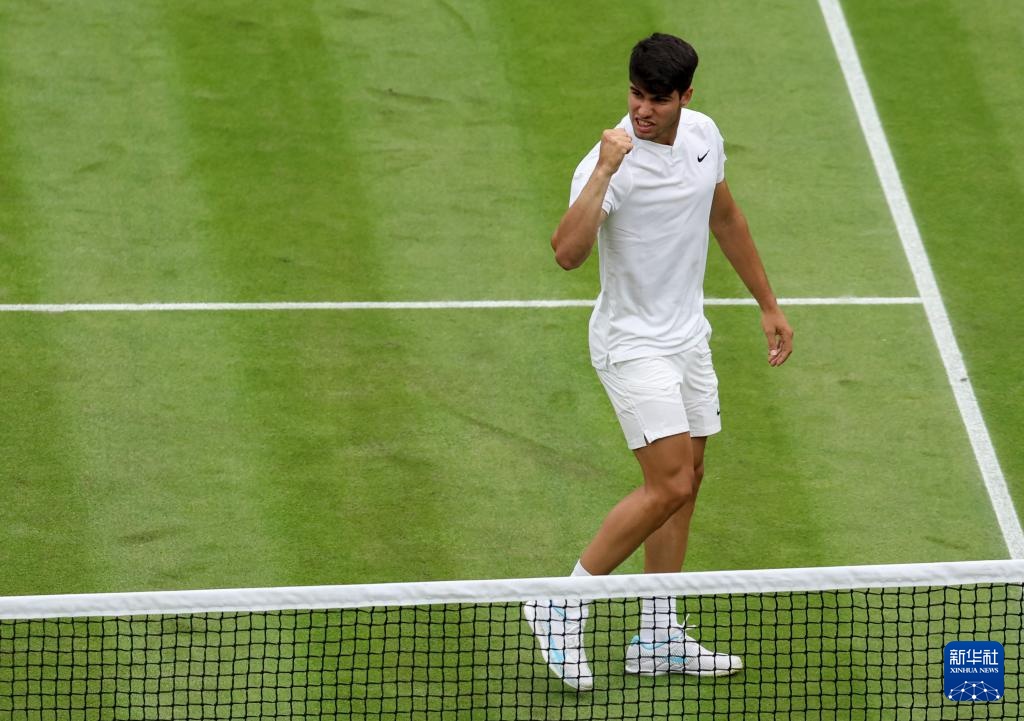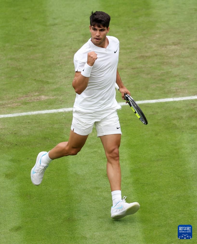 7月3日,阿尔卡拉斯获胜后庆祝。新华社记者 韩岩 摄