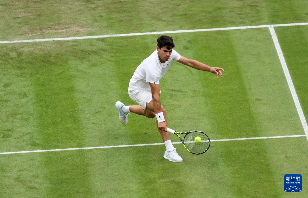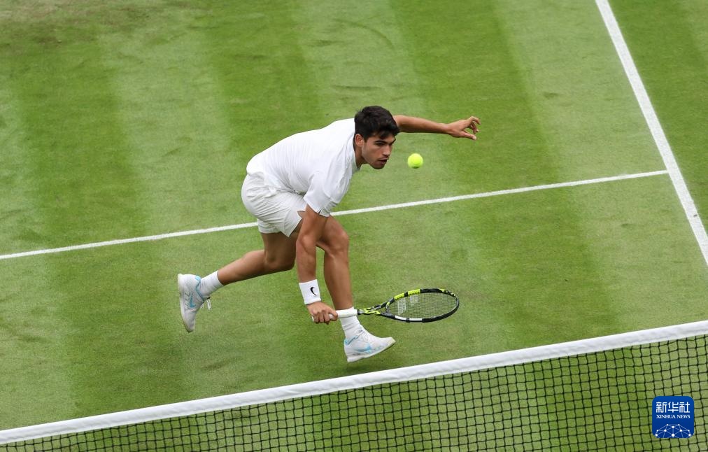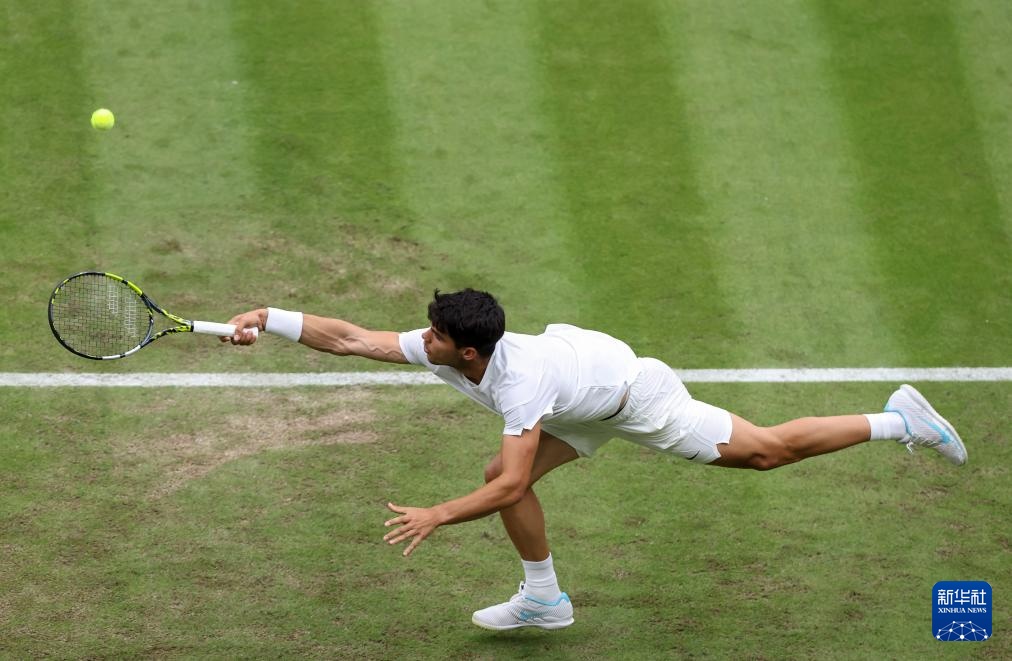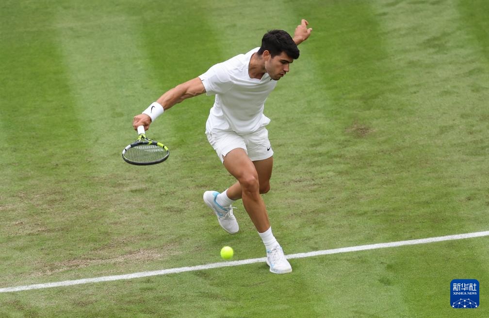 7月3日,阿尔卡拉斯在比赛中回球。新华社记者 韩岩 摄