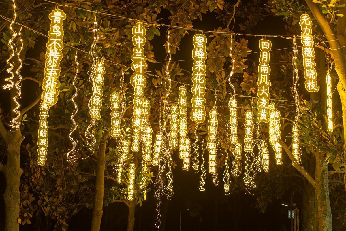 多处国风小景与灯火交相辉映,星光为笔,国风作画,别有韵味。造型灯组里,宇航员化身戏曲潮人。国风灯笼点亮阑珊灯火,上百个诗词卷轴和纱幔尽显“中国式浪漫”。唯美自然与诗词文化融合,处处都是沉浸式国风氛围,光影诗画夜,妙哉!