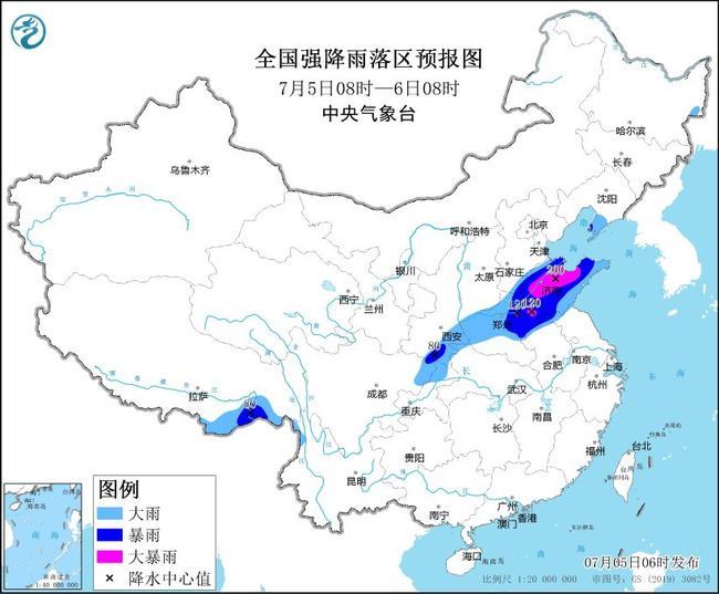 预计,7月5日08时至6日08时,四川盆地东北部、陕西东南部、湖北西北部、河南中北部、河北东南部、山东、苏皖北部及西藏东南部、云南西北部等地部分地区有大到暴雨,其中,山东中北部和西南部、河南东北部等地部分地区有大暴雨(100~200毫米)。上述部分地区伴有短时强降水(最大小时降雨量30~60毫米,局地可超过80毫米),局地有雷暴大风等强对流天气。