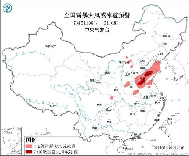 预计7月5日08时至6日08时,辽宁南部、山西北部和南部、河北南部、山东、河南东部、西部和南部、安徽北部、江苏北部、四川东北部等地的部分地区将有8级以上雷暴大风或冰雹天气,其中,山东中部、河南东部等地的部分地区将有10级以上雷暴大风,最大风力可达11级以上;辽宁南部、陕西南部、山西南部、河北南部、山东、河南、安徽北部、江苏北部、湖北西部、四川东北部、云南西南部、广西南部、广东西南部、海南岛中西部等地的部分地区将有小时雨量大于20毫米的短时强降水天气,其中,山东中部、河南中东部、安徽北部等地的部分地区小时雨量大于50毫米,最大可达80毫米以上。