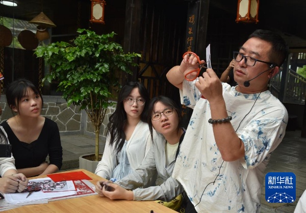 7月3日,香港师生在贵州省务川县龙潭村体验仡佬族剪纸技艺。新华社记者 骆飞 摄