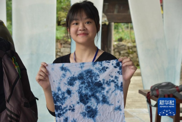 7月3日,香港学生在贵州省务川县龙潭村展示制作的扎染作品。新华社记者 骆飞 摄