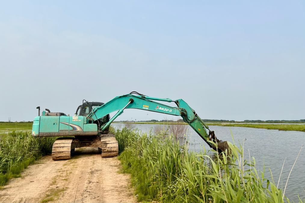 左边是一眼望不尽的稻田,右边是一眼望不尽的水面,中间是一条4米左右宽的河堤。一辆辆挖掘机正在不断地加固河堤,水面距离堤顶只有几十厘米,且水位还在上涨。