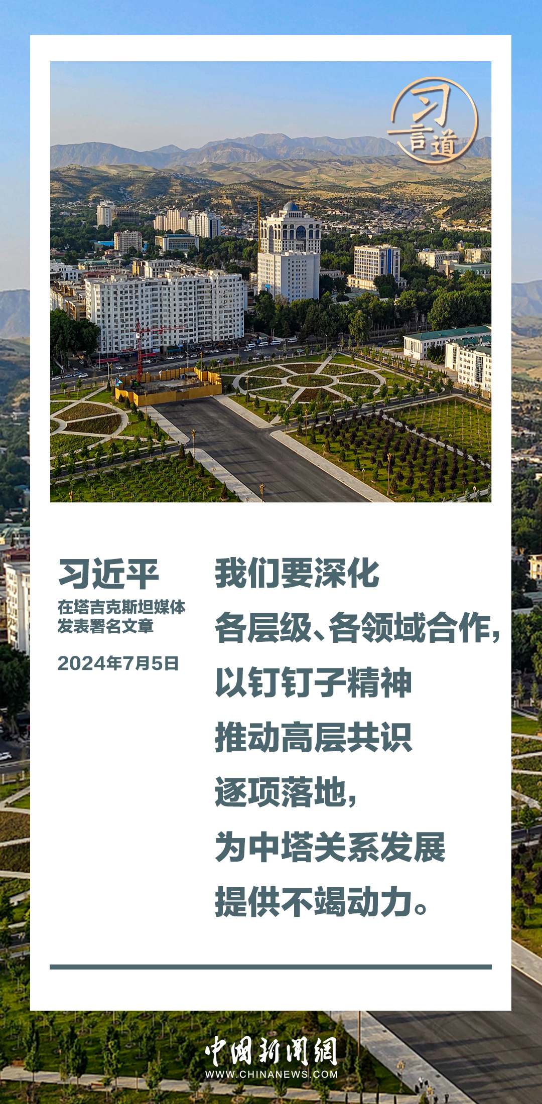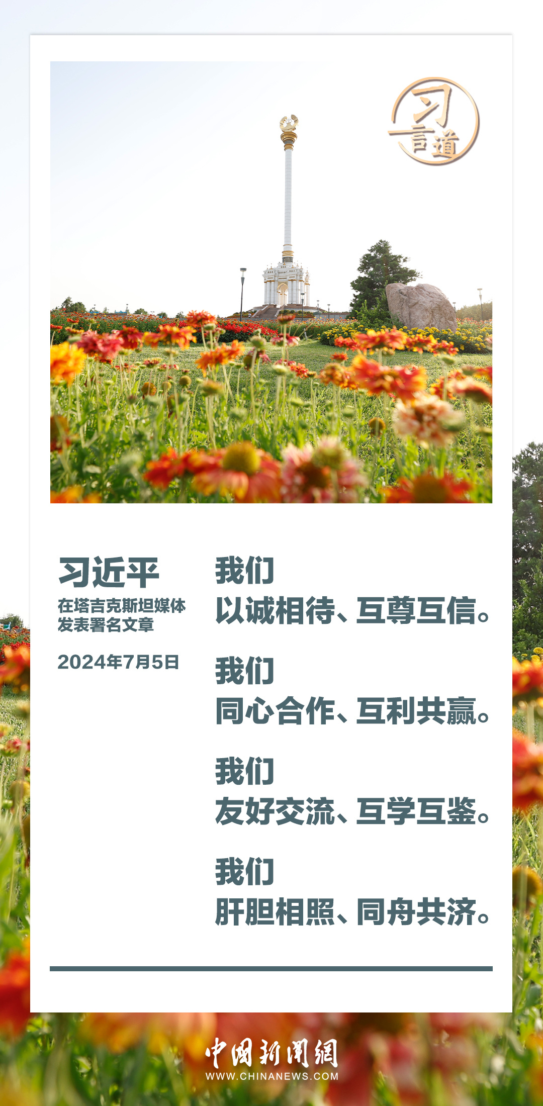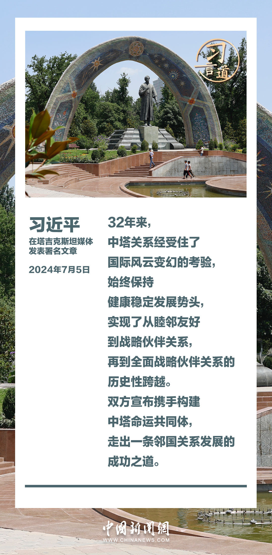 7月5日,在对塔吉克斯坦进行国事访问之际,国家主席习近平在塔吉克斯坦《人民报》和“霍瓦尔”国家通讯社发表题为《共创中塔关系美好明天》的署名文章。习近平指出——