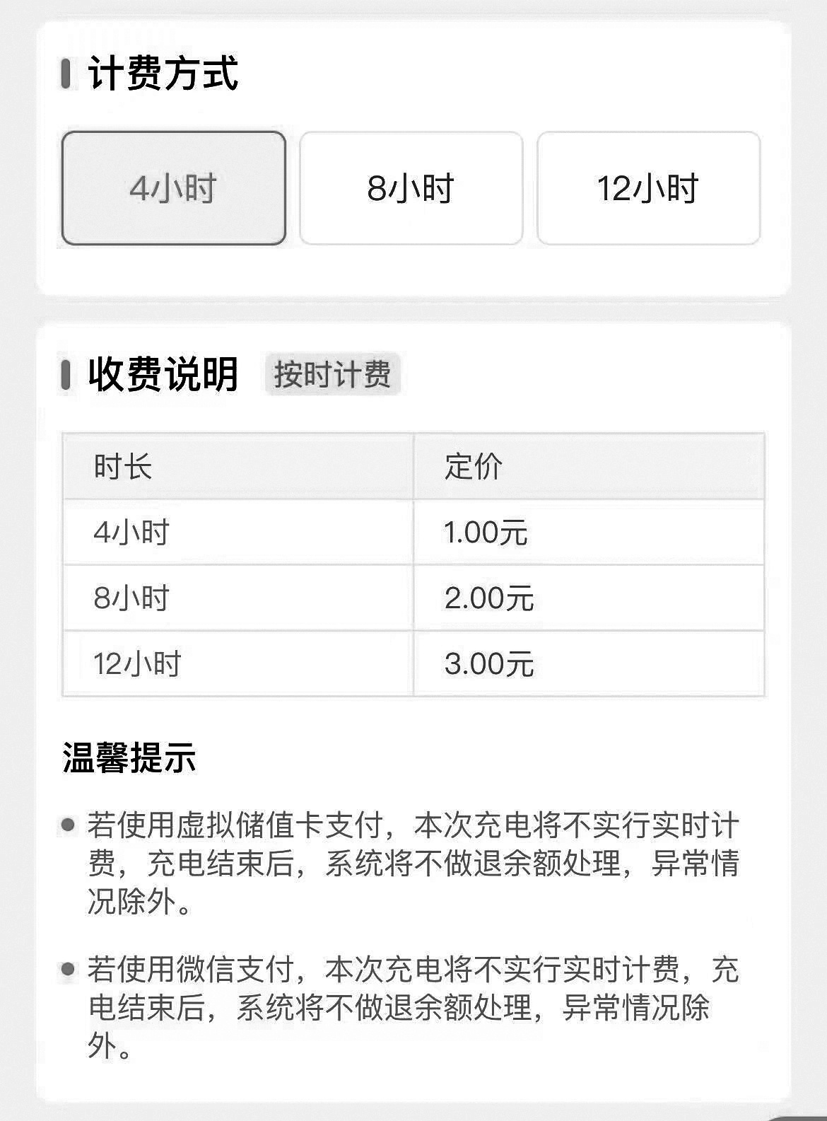 值得注意的是,按照时间套餐收费的价格,不同品牌的充电设备也不尽相同。例如,“阿拉充电”1元可充电4小时,“智慧充”1元可充6小时,“来点电”1元只能充电3小时。且大多按时间收费的套餐,均如许先生所说,即使充电提前完成,多购买的充电时长也不会退还。
