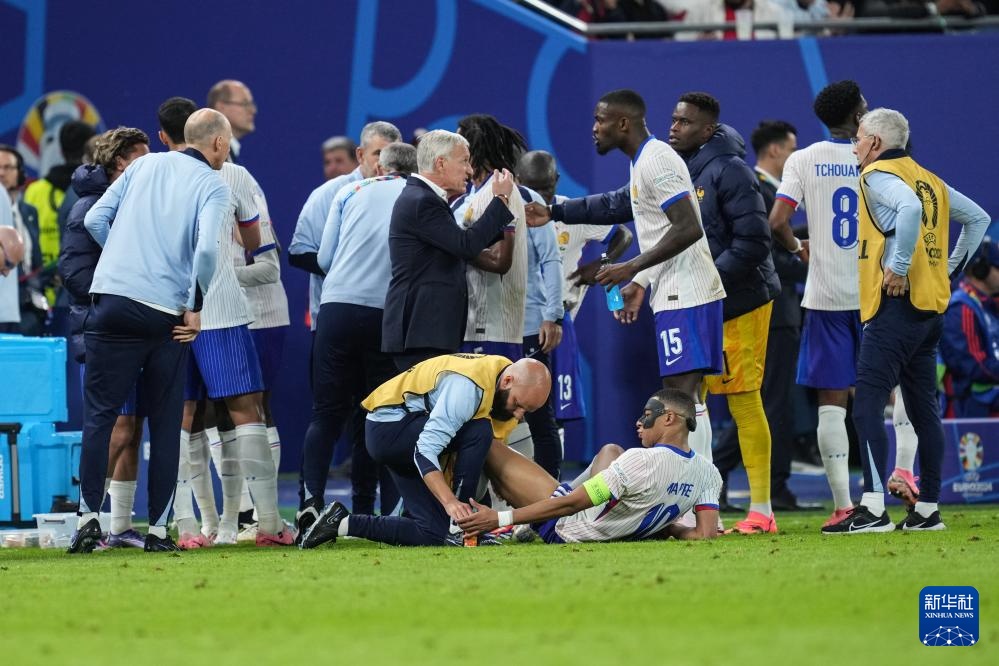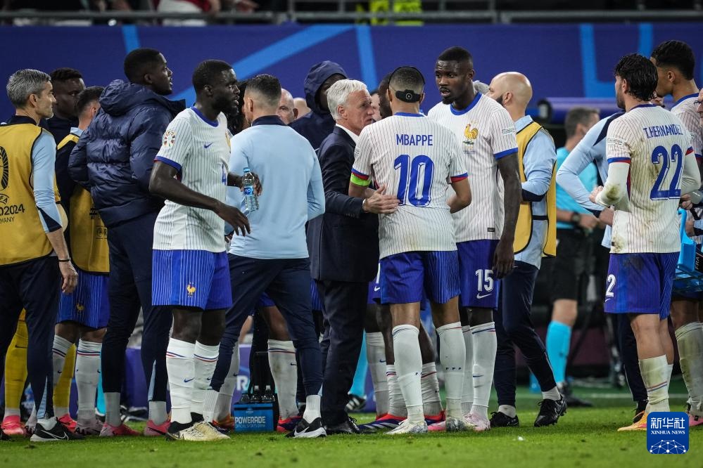 7月5日,法国队主教练德尚(中)在加时赛下半场开始前与球员姆巴佩交谈。新华社记者 潘昱龙 摄
