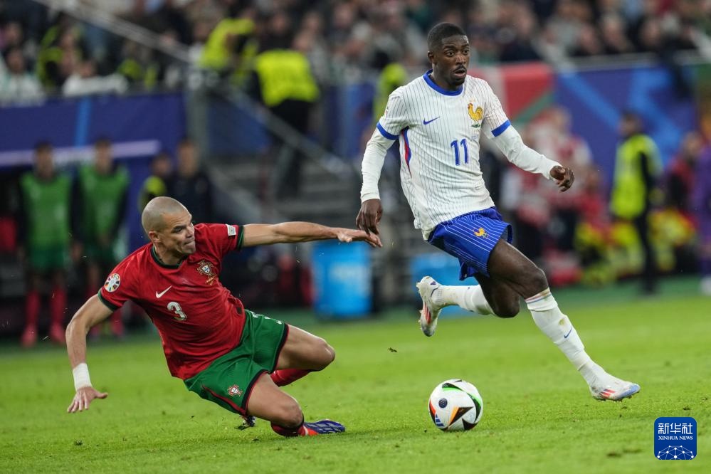7月5日,法国队球员登贝莱(右)带球突破葡萄牙队球员佩佩。新华社记者 潘昱龙 摄