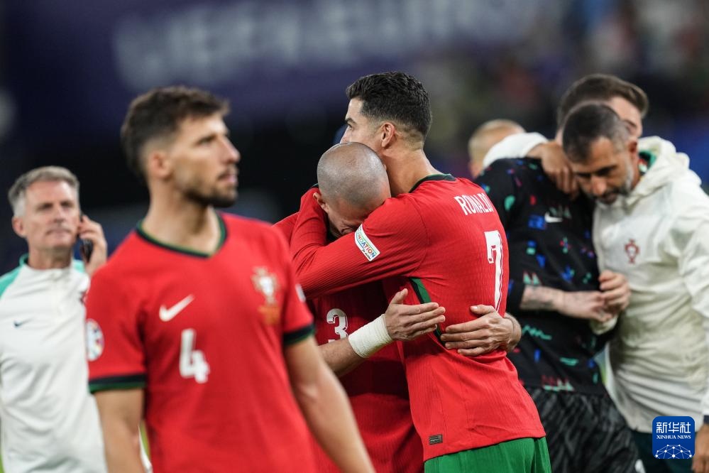 7月5日,葡萄牙队球员克·罗纳尔多(中右)比赛后安慰队友佩佩。新华社记者 潘昱龙 摄