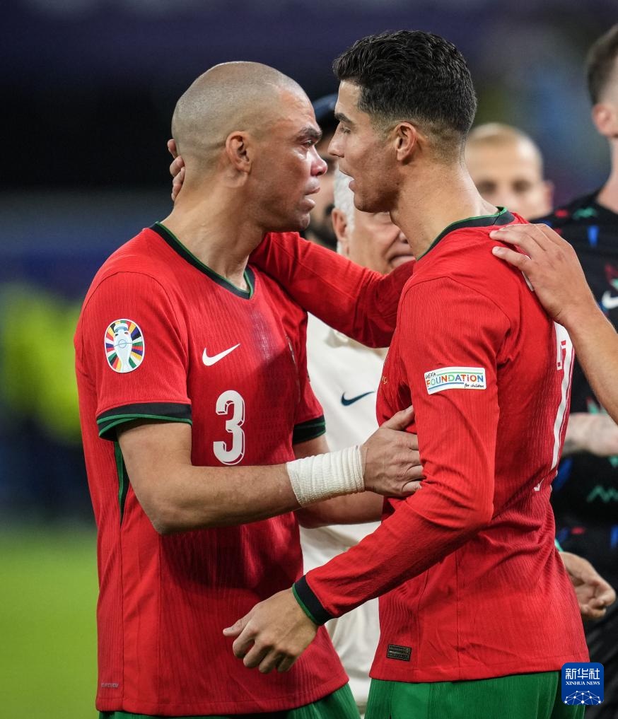 7月5日,葡萄牙队球员克·罗纳尔多(右)比赛后安慰队友佩佩。新华社记者 潘昱龙 摄