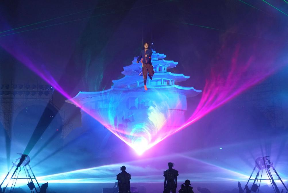 7月5日,在河北省秦皇岛市北戴河区碧螺塔酒吧公园,演员为游客表演海上实景奇幻秀《塔秀》。