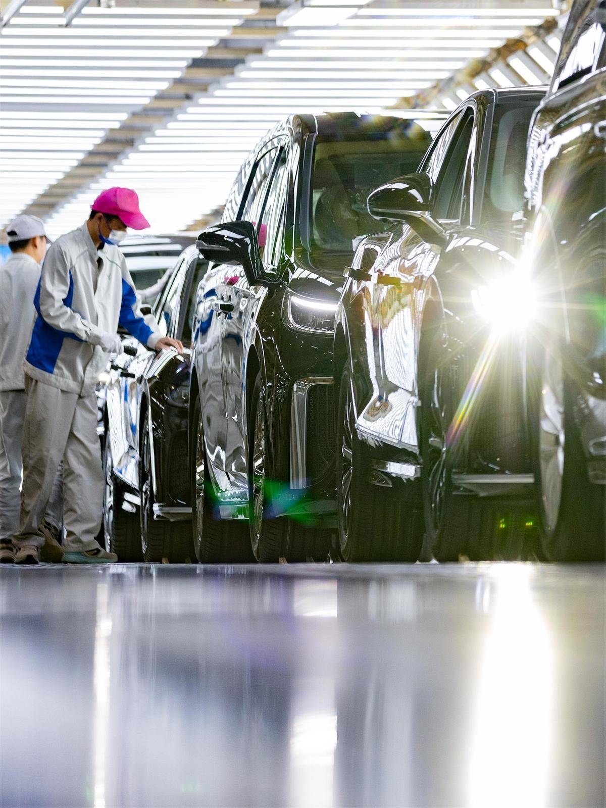 岚图汽车总装车间检测线的员工对车辆进行下线前的检测。今年4月,岚图汽车第10万辆新能源汽车整车下线。今年还将奋力达成第二个10万辆新能源汽车的年度销量目标。(湖北日报全媒记者 柯皓 摄)