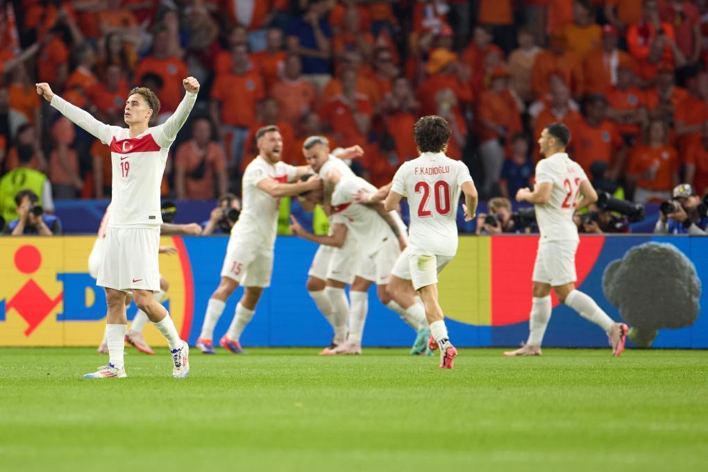 7月6日,土耳其队球员在比赛中庆祝队友阿卡伊丁的进球。新华社记者 孟鼎博 摄