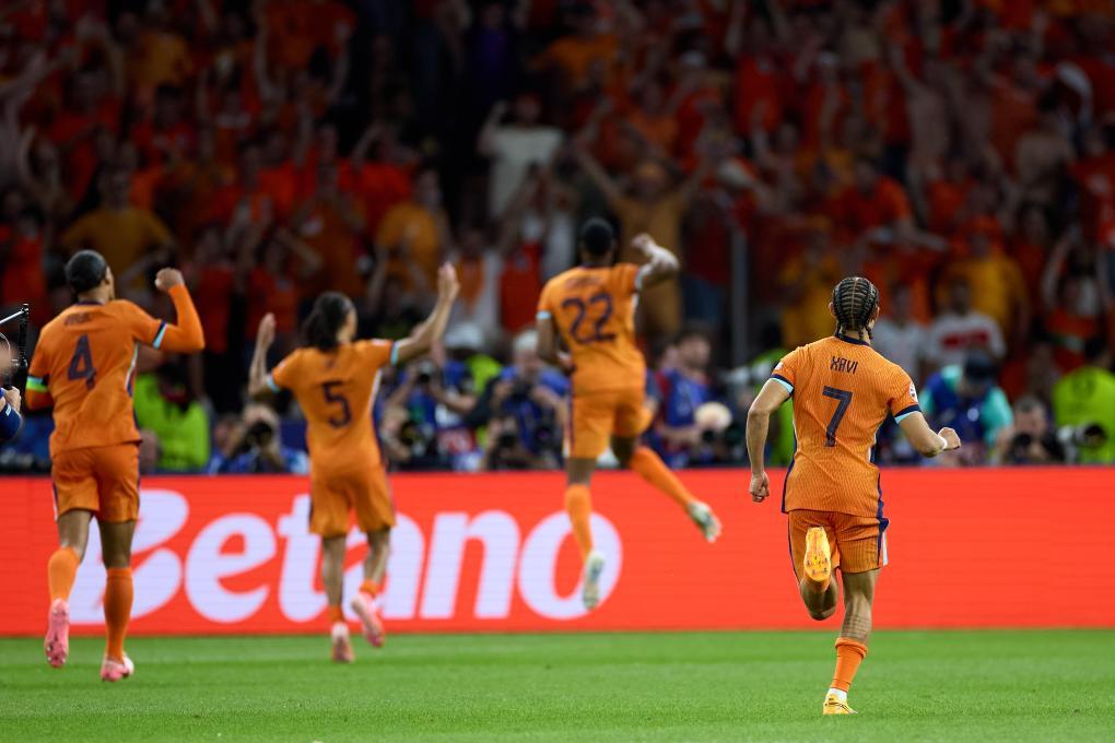 7月6日,荷兰队球员在比赛后庆祝胜利。新华社记者 孟鼎博 摄
