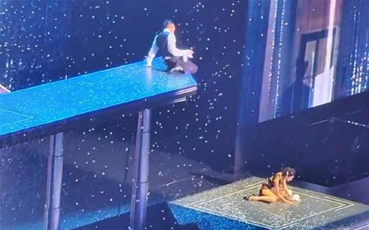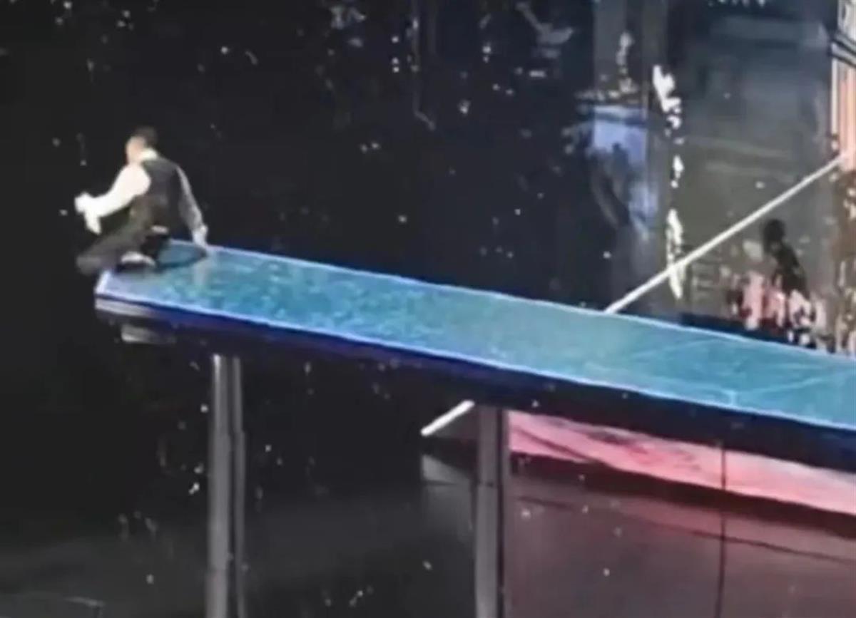 刘德华滑跪到了高台的边缘 (网络视频截图)
