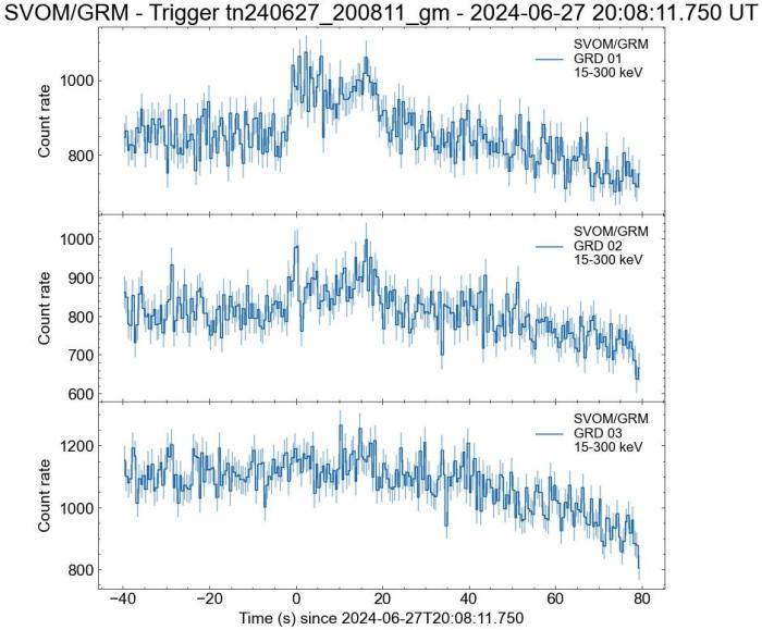 据中国科学院中法天文卫星项目团队介绍,中法天文卫星(又称“天基多波段空间变源监视器”,英文缩写SVOM)于6月22日发射升空。星上搭载的中国科学院高能物理研究所研制的伽马射线监测器6月24日正式开机;6月27日开启探测器高压,进行在轨测试,伽马射线监测器当天就成功捕捉到首个伽马射线暴(编号GRB240627B),这是中法天文卫星的首个在轨科学探测成果。