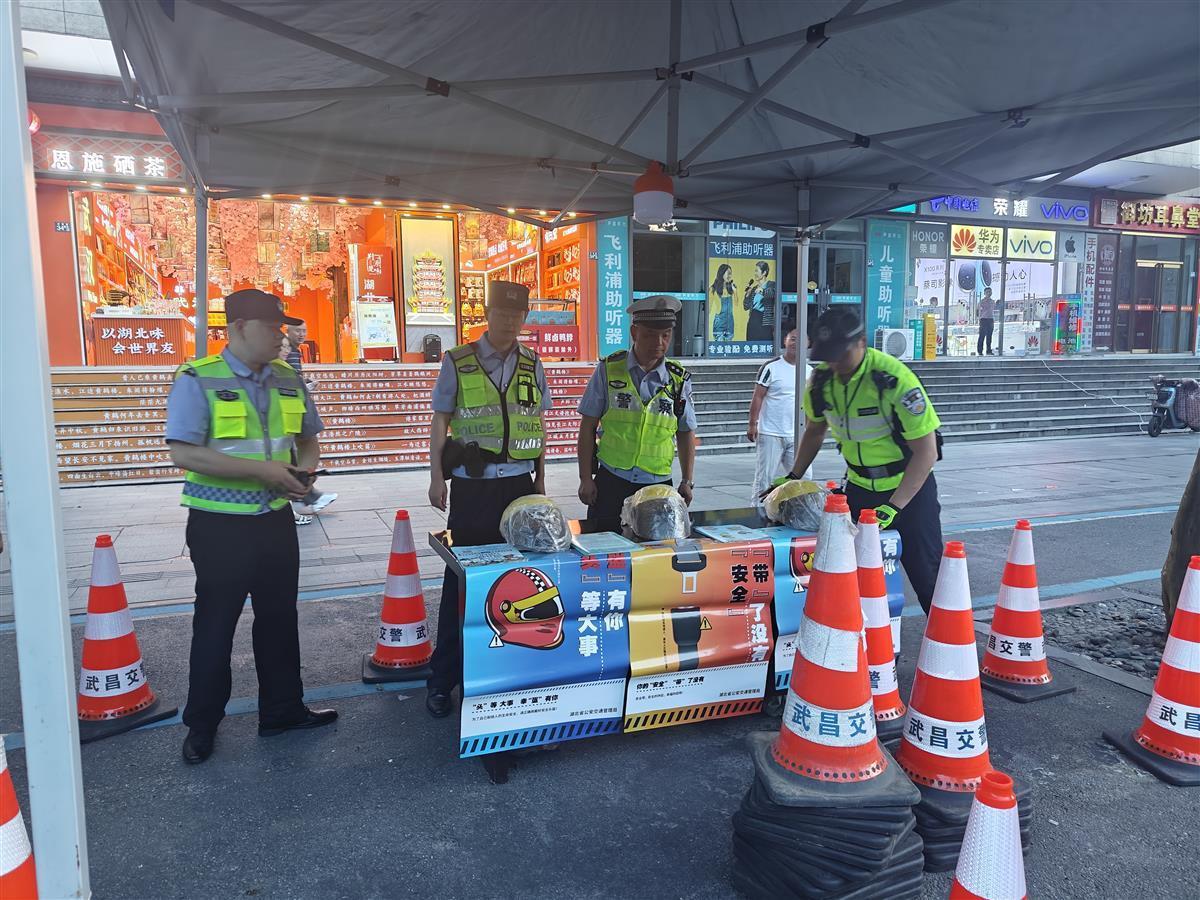 “骑行电动自行车要走非机动车道”,在武昌区武珞路云鹤大厦整治点,武昌区交通大队执勤交警正在耐心劝导驾驶人规范行驶。武昌区交通大队采取交巡结合、联勤联动方式,联合警务站在友谊大道新生路口、武珞路云鹤大厦路口设置宣防执勤点,现场教授周边居民电动自行车上牌、车辆安全行驶知识,深受群众欢迎。同时还准备了共享头盔,供电动自行车驾驶员租借使用。执勤民辅警采取现场说“法”、发放宣传页的形式,营造安全文明出行的交通氛围。