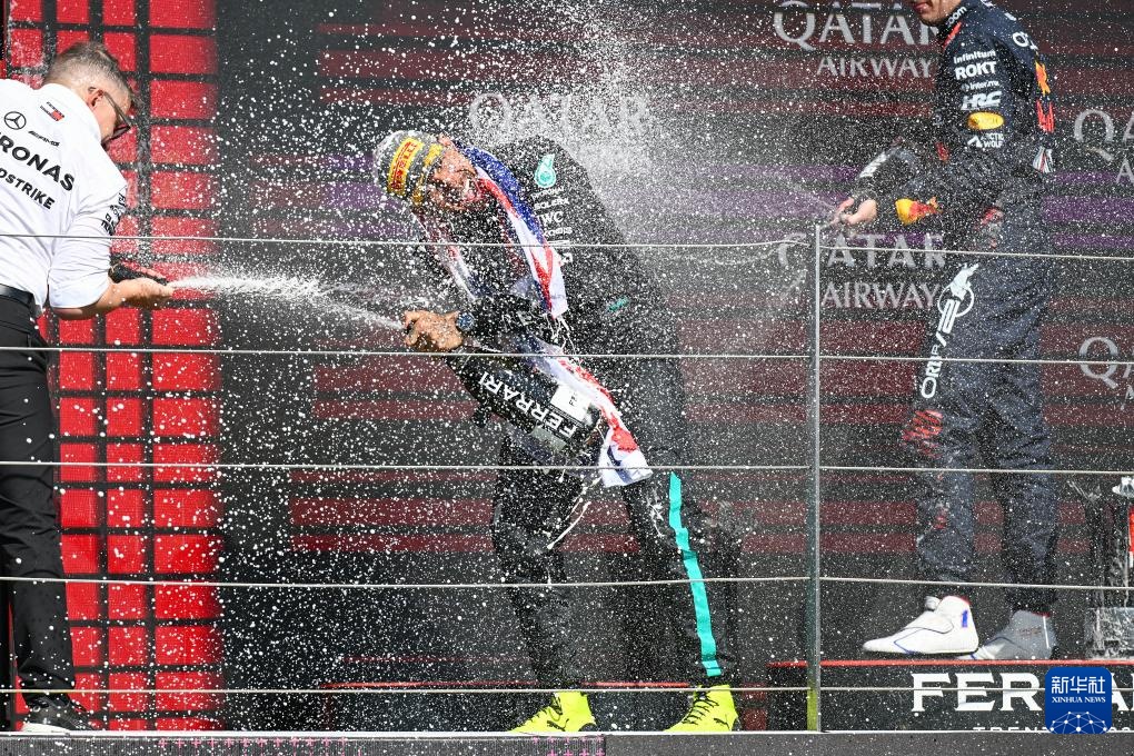 7月7日,汉密尔顿(中)在颁奖仪式上喷香槟庆祝。新华社记者 吴鲁 摄