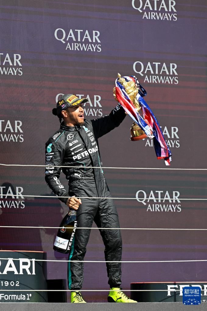 7月7日,汉密尔顿在颁奖仪式上庆祝。新华社记者 吴鲁 摄