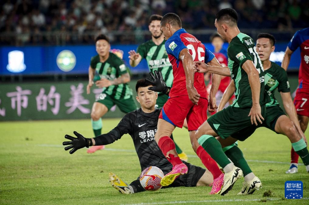 7月7日,浙江队守门员赵博(左下)封堵梅州客家队球员罗德里格的射门。新华社记者 江汉 摄