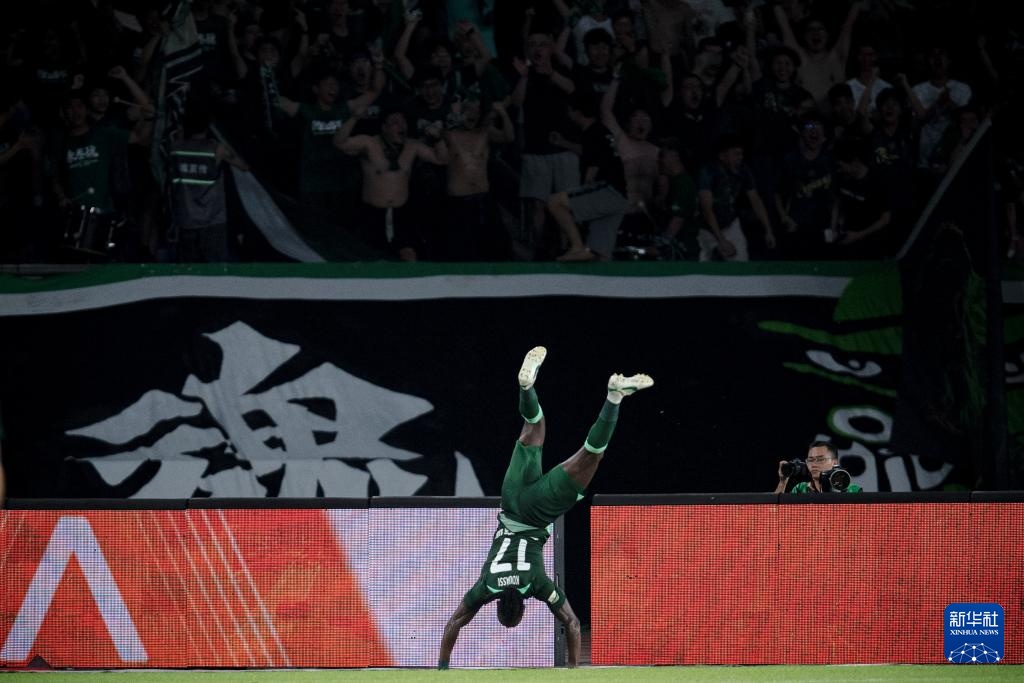 7月7日,浙江队球员埃弗拉进球后庆祝。新华社记者 江汉 摄