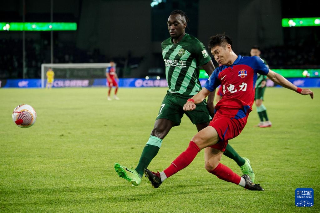 7月7日,浙江队球员莱昂纳多(左二)射门得分。新华社记者 江汉 摄