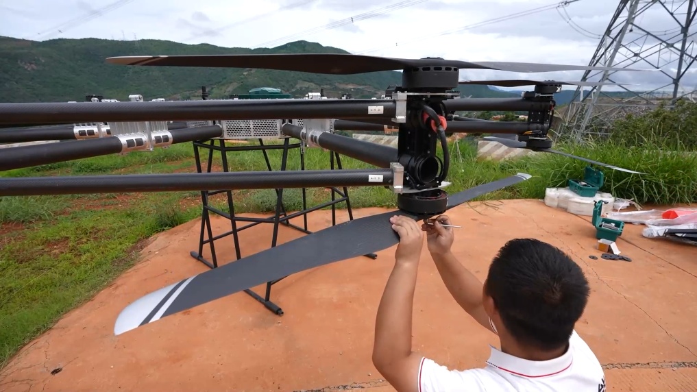 本次作业使用的是我国自主研发的电力运输重载电动无人机,这种多旋翼无人机特点是高频率、多架次,每天可开展百余架次飞行,能有效满足短距离、高落差、多频作业需求。