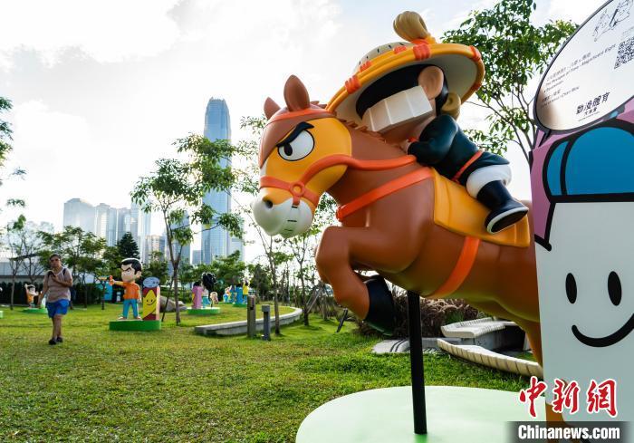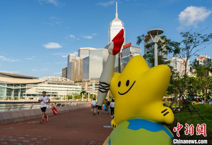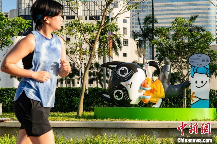 图为动漫形象雕塑“陪伴”在维港海滨跑步健身的市民。中新网记者 侯宇 摄