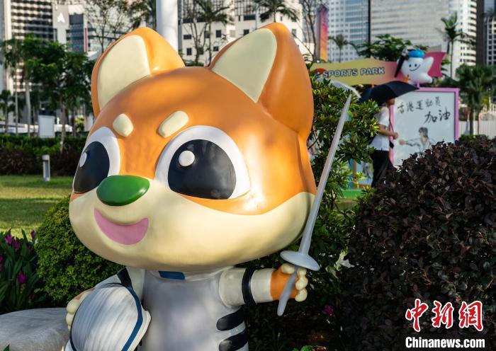 图为香港特区政府康乐及文化事务署吉祥物“活力仔”扮成击剑运动员的雕塑。中新网记者 侯宇 摄
