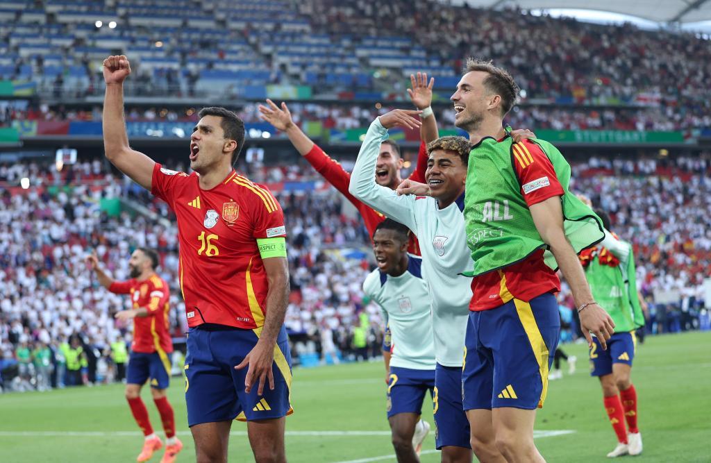 7月5日,西班牙队球员赛后庆祝比赛胜利。新华社记者 白雪飞 摄