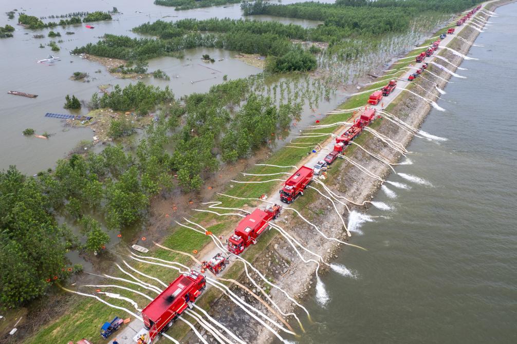 7月9日,在湖南华容县团洲垸洞庭湖大堤,排涝作业在进行中(无人机照片)。新华社记者 陈思汗 摄