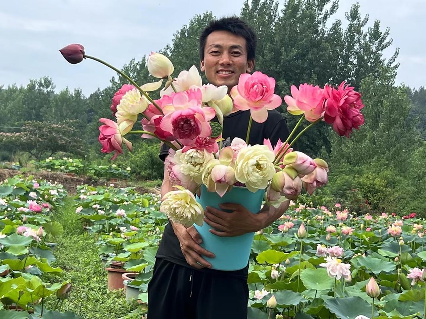 王磊是一名90后,毕业后一直在外打工,2018年他毅然决定返乡创业。在老家选择了种植观赏荷花。到现在,他已经种了5年的荷花,荷花基地目前共种植荷花20余亩,荷花盆栽一万多盆,荷花品种上百种,春种夏收,收益好、见效快。