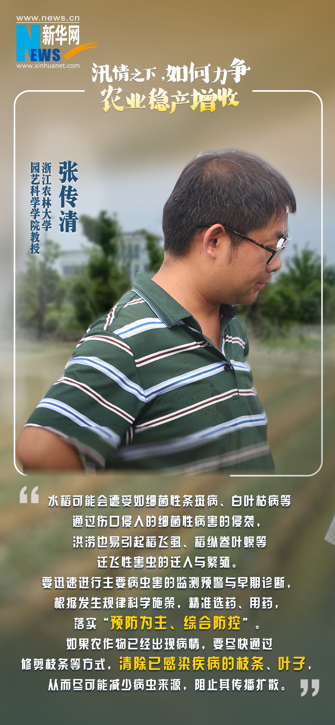 降雨后迅速升温形成的高温高湿环境,极易诱发多种病虫害。比如,水稻可能会遭受如细菌性条斑病、白叶枯病等通过伤口侵入的细菌性病害的侵袭,洪涝也易引起稻飞虱、稻纵卷叶螟等迁飞性害虫的迁入与繁殖。目前,穗颈瘟已经在浙江金华等地,尤其是感病水稻品种上有所蔓延,应该引起足够的重视。同时,柑橘溃疡病、炭疽病等,以及蔬菜等经济作物的疫病、霜霉病、青枯病、根腐病、枯萎病和茎基腐病等也将加重发生。