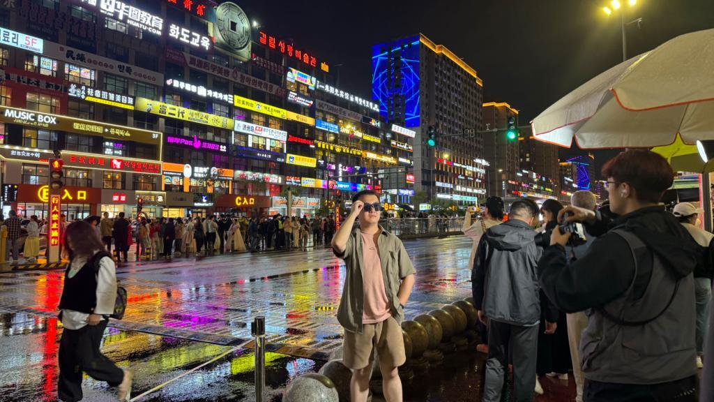 6月14日,游客在延边大学对面的“网红弹幕墙”拍照。新华社记者 邵美琦 摄