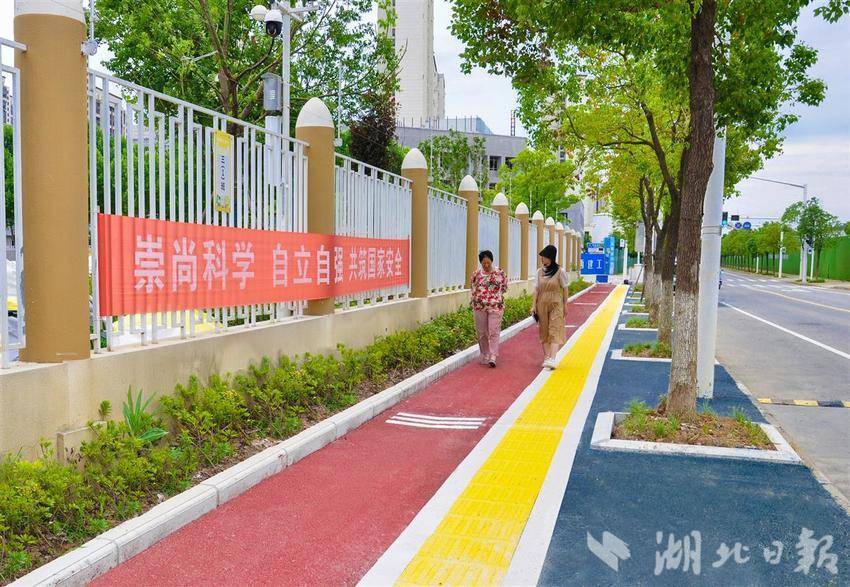 湖北日报讯(记者刘洁、通讯员李双林、潘婷)最近,路过武汉新城中心小学的市民发现,一条红蓝配色,点缀着美丽樱花图案的人行道让人眼前一亮。