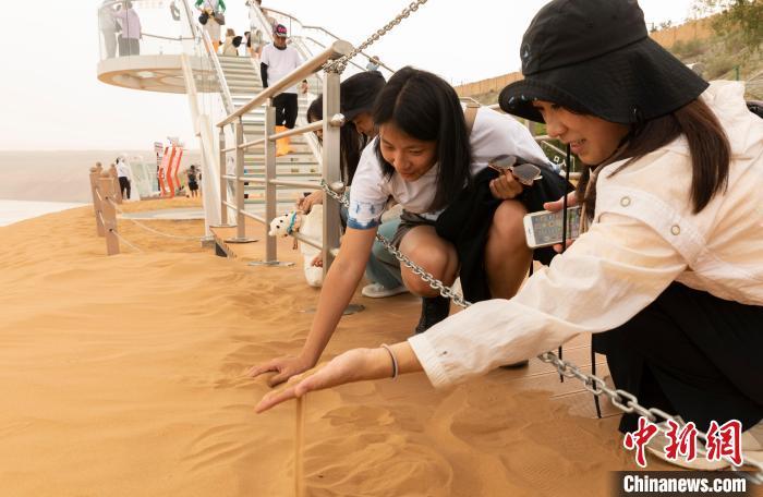 7月11日,宁夏沙坡头国家级自然保护区,台湾青年感受细腻的沙子。7月7日至13日,由宁夏台办主办的“探访星星的故乡——宁台青年文化之旅”交流活动在当地举行,20余名台湾青年参访宁夏。中新社记者 杨迪 摄