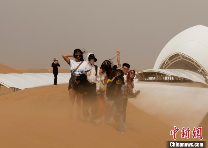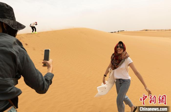 7月11日,宁夏沙坡头国家级自然保护区,台湾青年在沙漠中拍照留念。7月7日至13日,由宁夏台办主办的“探访星星的故乡——宁台青年文化之旅”交流活动在当地举行,20余名台湾青年参访宁夏。中新社记者 杨迪 摄