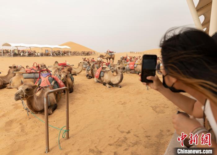7月11日,宁夏沙坡头国家级自然保护区,台湾青年为萌萌的骆驼拍照。7月7日至13日,由宁夏台办主办的“探访星星的故乡——宁台青年文化之旅”交流活动在当地举行,20余名台湾青年参访宁夏。中新社记者 杨迪 摄