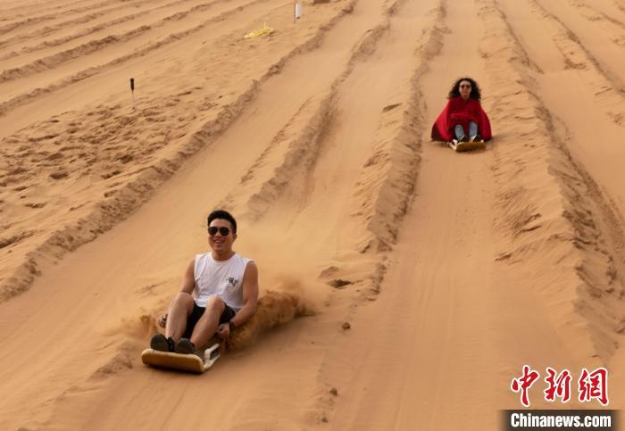 7月11日,宁夏沙坡头国家级自然保护区,台湾青年体验滑沙。7月7日至13日,由宁夏台办主办的“探访星星的故乡——宁台青年文化之旅”交流活动在当地举行,20余名台湾青年参访宁夏。中新社记者 杨迪 摄