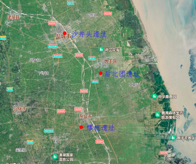 江苏盐城沙井头、缪杭、后北团遗址区位图。(受访单位供图)