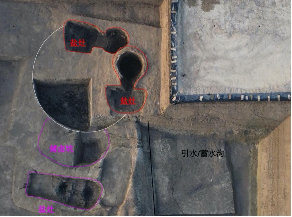 煎卤成盐,是古人制盐的关键步骤。在盐灶上摆放盘铁或者铁锅,烧至高温,将卤水置于铁锅内煎煮,水分蒸发后卤水结晶成盐。考古人员在距离缪杭遗址40公里的后北团遗址清理出明代的一处砖砌淋卤坑和紧邻分布的3座盐灶。